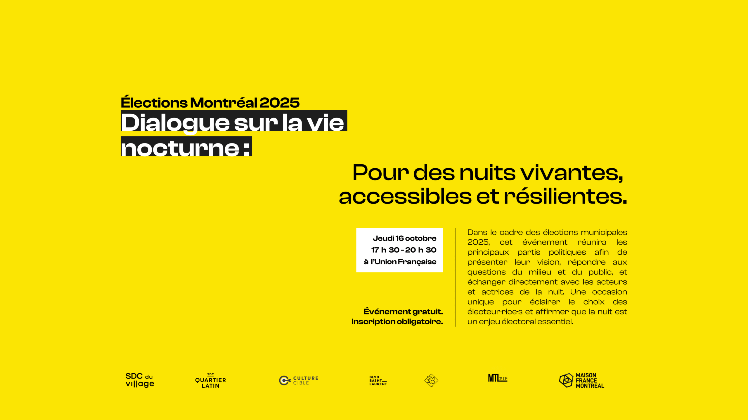 MTL 24/24, Les SMAQ, l’Union Française, Culture Cible and the SDCs of Boulevard St-Laurent, the Village, and the Quartier Latin invite you to a major electoral dialogue on the future of nightlife, on Thursday, October 16, 2025, from 5:30 p.m. to 8:30 p.m. at l’Union Française (429 Viger Ave East).